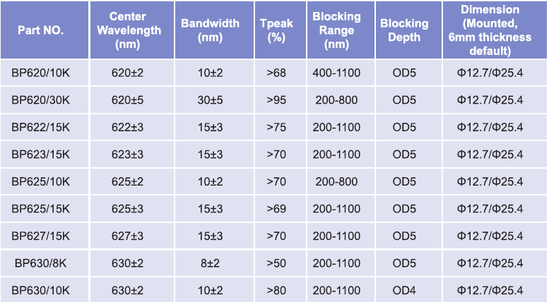 帶通濾光片波長(zhǎng)范圍:620nm-630nm