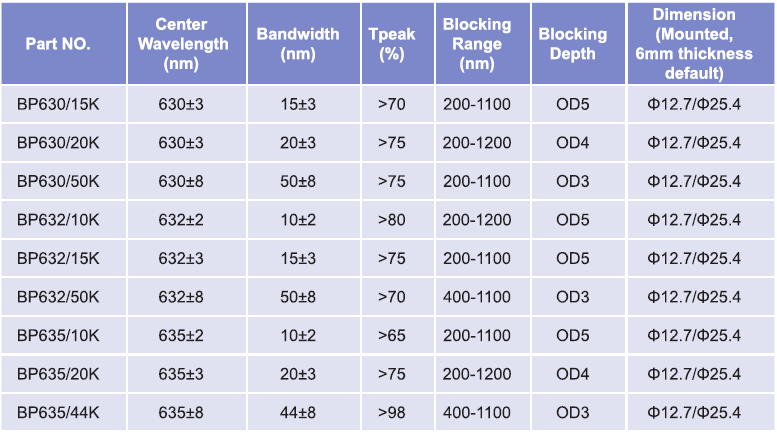 帶通濾光片波長(zhǎng)范圍:630nm-635nm