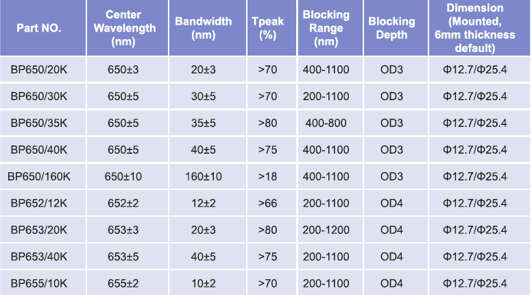 帶通濾光片波長(zhǎng)范圍:650nm-655nm
