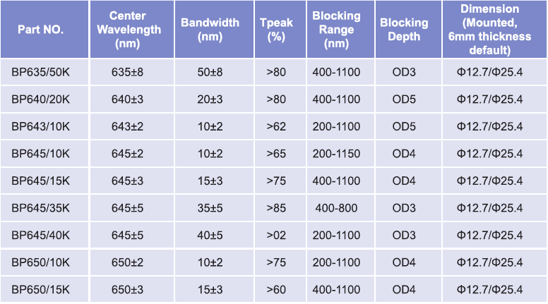 帶通濾光片波長(zhǎng)范圍:635nm-650nm