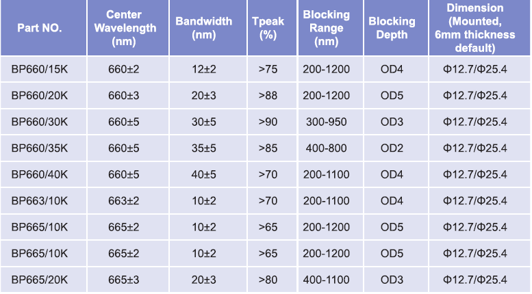 帶通濾光片波長(zhǎng)范圍:660nm-665nm