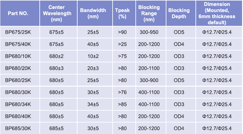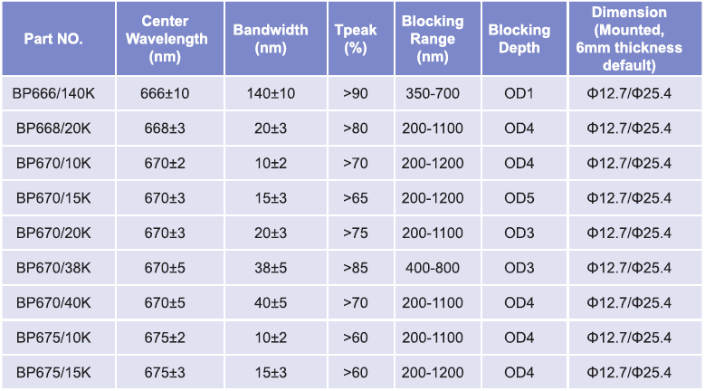 帶通濾光片波長(zhǎng)范圍:665nm-675nm