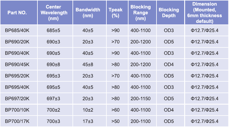帶通濾光片波長(zhǎng)范圍:655nm-660nm