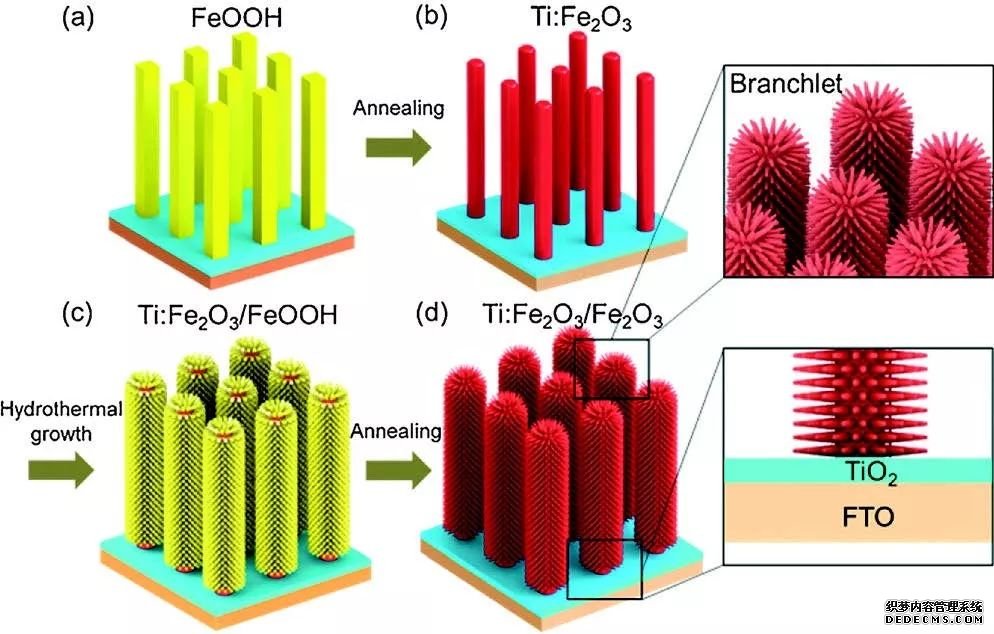 但是,F(xiàn)e2O3同時(shí)也存在著吸光系數(shù)差、光生空穴傳輸距離短(2~4 nm) 等限制因素,導(dǎo)致了目前基于Fe2O3光陽(yáng)的光電轉(zhuǎn)化效率依舊較低。由于Fe2O3的空穴傳輸距離太短,因此對(duì)Fe2O3的微納結(jié)構(gòu)調(diào)控顯得尤其重要。