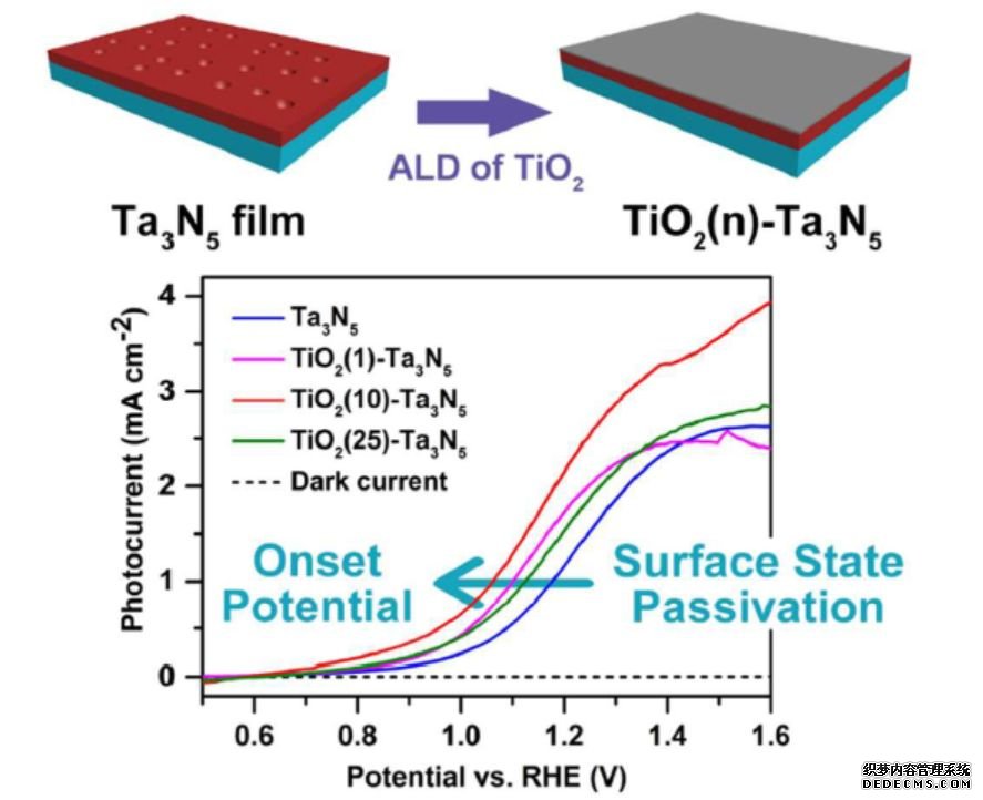 天津大學(xué)鞏金龍教授課題組通過(guò)ALD的方法在Ta3N5上沉積了10 nm厚的TiO2,減少了表面復(fù)合,降低了100 mV左右的開啟電勢(shì)。為了獲得較薄且均勻的鈍化層,一般都 使用濺射或ALD 等方法。(上圖,DOI:10.1039/C6CC03411J)