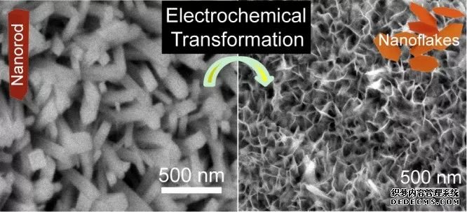 Yat Li課題組通過(guò)對(duì)Fe2O3納米棒進(jìn)行電化學(xué)誘導(dǎo),生成了約10 nm 厚的納米片狀Fe2O3,其光電流也提高了3倍。(上圖,DOI:10.1016/j.nanoen.2014.12.023)