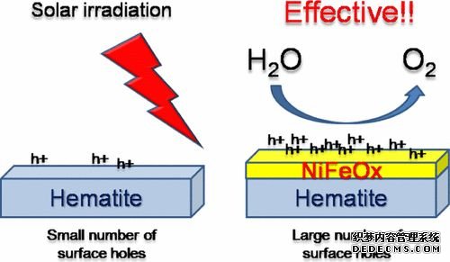 但目前在Fe2O3上降低開啟電勢(shì)有效的催化劑為NiFeOx。關(guān)于Fe2O3的開啟電勢(shì)差,Dunwei Wang課題組認(rèn)為是由于Fe2O3大量的表面態(tài)導(dǎo)致費(fèi)米能級(jí)釘扎,通過(guò)NiFeOx助催化劑的引入,大程度降低了表面費(fèi)米能級(jí)的釘扎效應(yīng),因此獲得了較好的開啟電勢(shì)。(上圖,DOI:10.1002/anie.201306263)