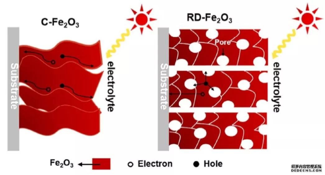 多孔結(jié)構(gòu)的BiVO4電由于減少了反射和透射,對(duì)光的吸收要高于平板結(jié)構(gòu)電。 此外,多孔結(jié)構(gòu)減少了光生空穴的傳輸距離,提高了光生載流子的分離效率,使光電流相比于致密電有了明顯的提高。但多孔結(jié)構(gòu)的光電也不是孔越多越好。 (上圖,DOI:10.1002/aenm.201301785)