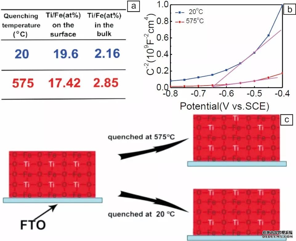 除了在材料制備后對(duì)表面偏析相進(jìn)行處理外,黃維院士團(tuán)隊(duì)對(duì)Fe2O3的煅燒過(guò)程進(jìn)行改進(jìn),發(fā)現(xiàn)通過(guò)短時(shí)間淬火的方式,能夠在制備過(guò)程中就降低表面的偏析、提高體相摻雜濃度,從而提高Fe2O3電的性能。XPS表征發(fā)現(xiàn),通過(guò)短時(shí)間高溫淬火可以有效降低Fe2O3表面的Ti偏析, 莫特肖特基曲線也發(fā)現(xiàn)高溫淬火后的載流子濃度相比于 常溫取出的Fe2O3高了6 倍,因此他們認(rèn)為高 溫淬火的方式可以將摻雜離子固定在材料晶格內(nèi)部,防止向表面偏析,從而減小表面復(fù)合,提高材料光電化學(xué)性能。(上圖,DOI:10.1002/cnma.201600108)