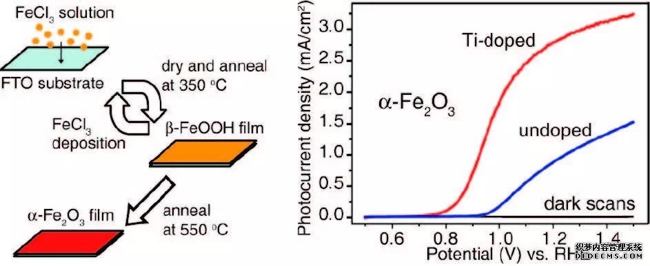 Michael Grätzel課題組在JACS發(fā)表的一項(xiàng)工作中,通過(guò)800 ℃高溫煅燒的方式,無(wú)意中將襯底FTO中的Sn摻雜進(jìn)了Fe2O3,使Fe2O3在1.23 V RHE 處的光電流由10 μA·cm-2提高到了0. 56 mA·cm-2。(上圖,DOI:10.1021/ja101564f)