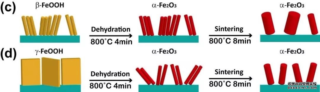 Yilin Liu等發(fā)現(xiàn) FeOOH的晶相結(jié)構(gòu)會(huì)對(duì)煅燒過(guò)程有影響:當(dāng)FeOOH 為緊密堆積的β相時(shí),煅燒過(guò)程中納米棒會(huì)燒結(jié),終得到的Fe2O3納米棒會(huì)比較粗(約65nm);而當(dāng)FeOOH為層狀結(jié)構(gòu)的γ相時(shí),煅燒過(guò)程中結(jié)構(gòu)會(huì)脫水?dāng)嗔,能生成超?xì)結(jié)構(gòu)的納米棒(約20 nm) ,其光電流相比于直徑較粗的Fe2O3,也有了1.5 倍的提升。(上圖,DOI:10.1088/1361-6463/aa6fb7)