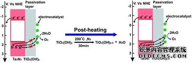 在對(duì)TiO2鈍化層的研究中,羅文俊課題組通過(guò)化學(xué)浴沉積的方法在Ta3N5上制備了一層TiO2,并且發(fā)現(xiàn)水溶液法制備的TiO2中含有的羥基基團(tuán)會(huì)影響電的性能。