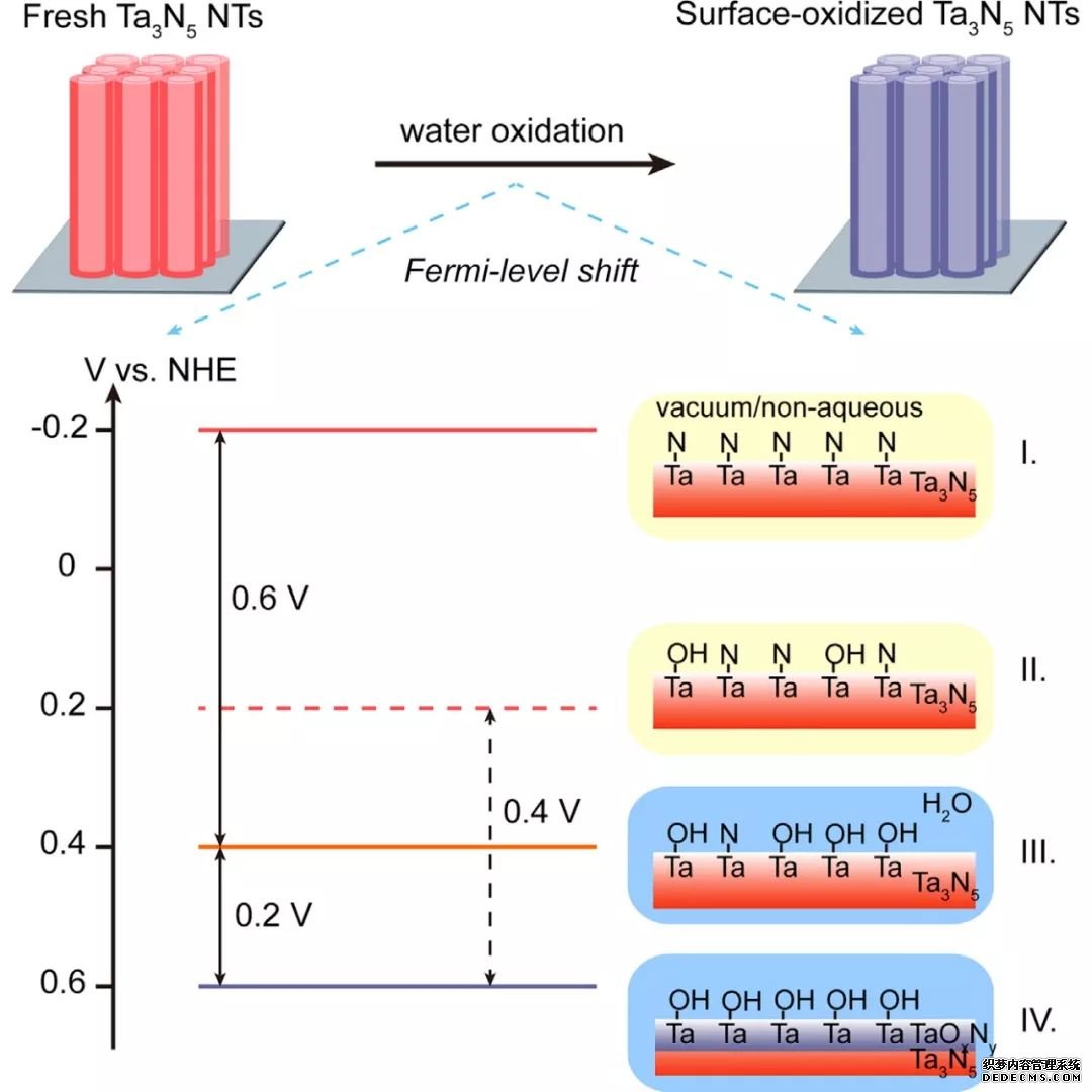 Dunwei Wang課題組在Chem發(fā)文,發(fā)現(xiàn)在光電化學(xué)分解水過(guò)程中,Ta3N5的表面會(huì)自氧化生成一層非 晶的富氧層,導(dǎo)致費(fèi)米能級(jí)下降,終導(dǎo)致其性能衰減。 因此,對(duì)Ta3N5的表面進(jìn)行鈍化處理,不僅能提高性能,對(duì)其長(zhǎng)期穩(wěn)定性的提高也十分重要。