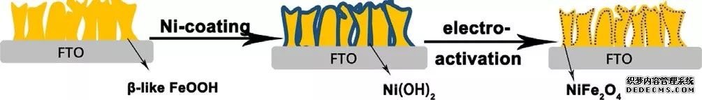隨后他們制備了亞穩(wěn)態(tài)、大孔道結(jié)構(gòu)的類β相( schwertmannite) FeOOH 薄膜電,并且在其表面負(fù)載了少量 Ni(OH)2。在外加偏壓下,覆蓋在亞穩(wěn)態(tài)類β相FeOOH表面的Ni2+會(huì)以某種離子或離子團(tuán)的形式進(jìn)入到類β相 FeOOH 的結(jié)構(gòu)孔道,與孔道周邊的Fe原子成鍵形成 NiFe2O4,使得雙層催化劑的產(chǎn)氧活性和穩(wěn)定性都大幅提升。α-FeOOH的晶型結(jié)構(gòu)穩(wěn)定,沒(méi)有大孔道。因此在外加偏壓下,α-FeOOH/Ni(OH)2并沒(méi)有展現(xiàn)出特殊的變化,僅是單純性能的疊加,產(chǎn)氧活性也小于β-FeOOH/Ni(OH)2。因此,在FeOOH、NiOOH雙層電催化劑中,F(xiàn)eOOH 的晶相對(duì)Fe/Ni 雙層結(jié)構(gòu)催化劑的性能有較大影響。(DOI:10.1002/asia.201700964)